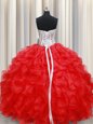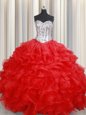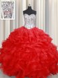 Smart Red Lace Up Sweetheart Beading and Ruffles Quince Ball Gowns Organza Sleeveless