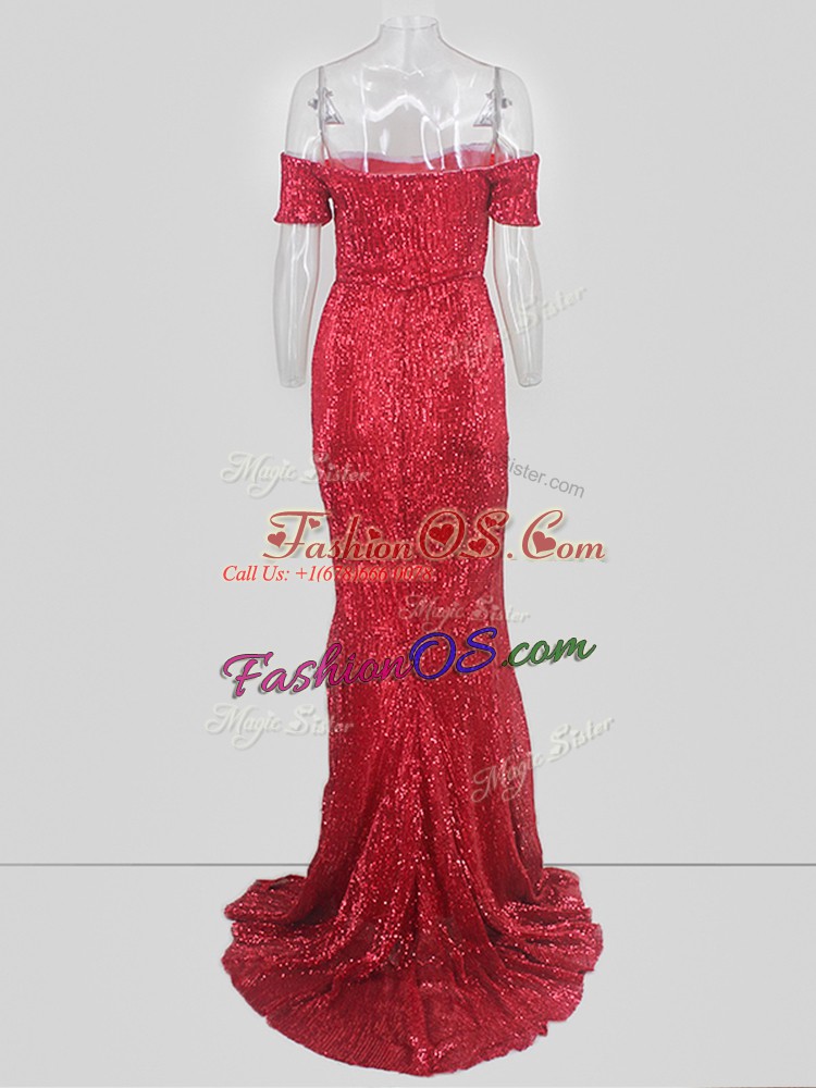 Home >  Prom Dresses >  Prom Dresses On Sale > Smart Red Mermaid Off The Shoulder Short Sleeves Sequins Homecoming Dress Sweep Train