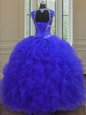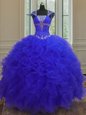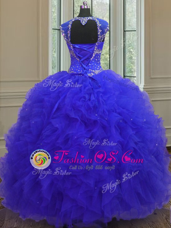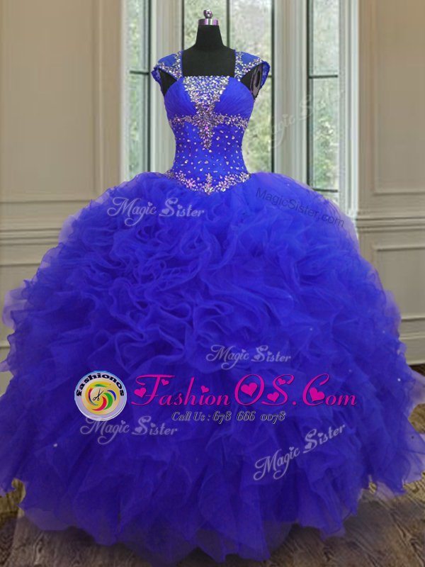 Smart Straps Blue Ball Gowns Beading and Ruffles and Sequins Quinceanera Gowns Lace Up Organza Cap Sleeves High Low
