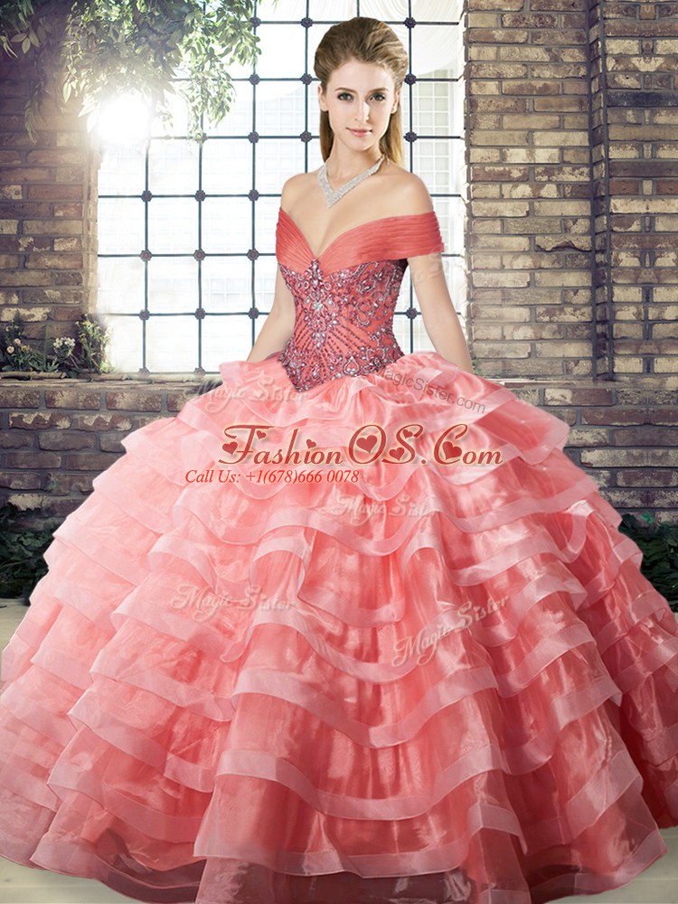Home >  Quinceanera Dresses >  Quinceanera Dresses 2019 > Smart Watermelon Red Off The Shoulder Lace Up Beading and Ruffled Layers Quinceanera Gown Brush Train Sleeveless