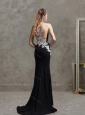Sophisticated Applique Brush Train Black Modest Prom Dress with Halter Top