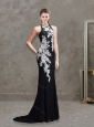 Home >  Prom Dresses >  Modest Prom Dresses > Sophisticated Applique Brush Train Black Modest Prom Dress with Halter Top