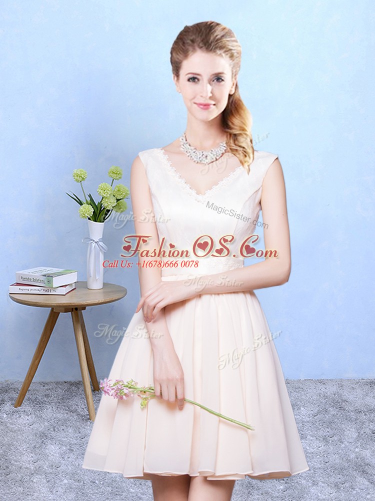 Home >  Special Occasion Dresses >  New Style Dama Dresses > Sophisticated Champagne Lace Up V-neck Ruching Court Dresses for Sweet 16 Chiffon Sleeveless