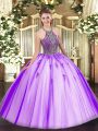 Sophisticated Floor Length Eggplant Purple Quinceanera Gowns Tulle Sleeveless Beading