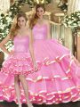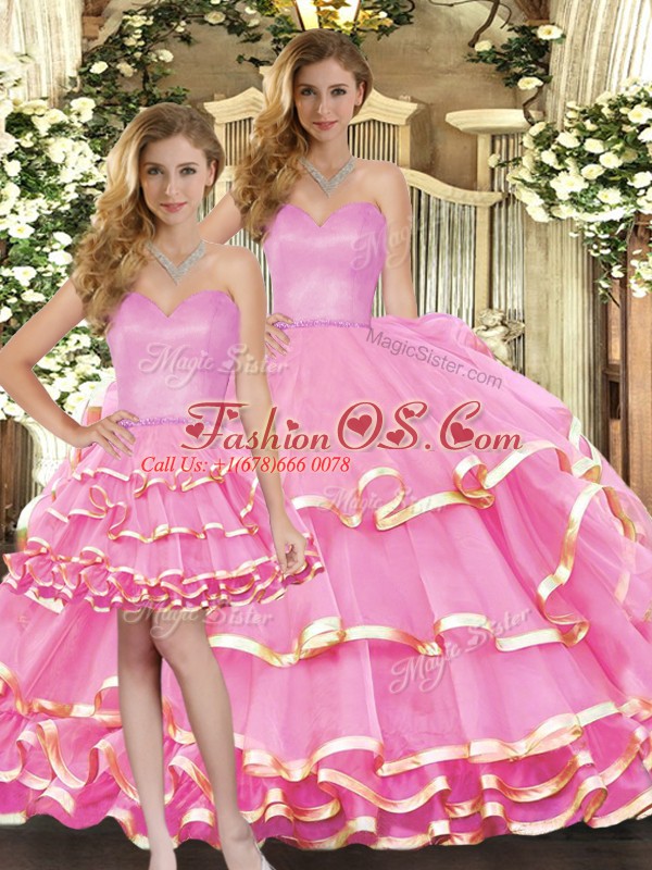 Sophisticated Floor Length Lace Up Vestidos de Quinceanera Rose Pink for Military Ball and Sweet 16 and Quinceanera with Ruffled Layers