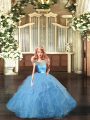 Sophisticated Lace and Ruffles Ball Gown Prom Dress Baby Blue Backless Sleeveless Floor Length