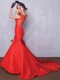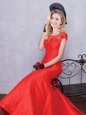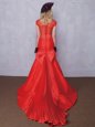 Sophisticated Mermaid Scoop Short Sleeves Brush Train Lace and Bowknot and Pleated Zipper Wedding Gowns