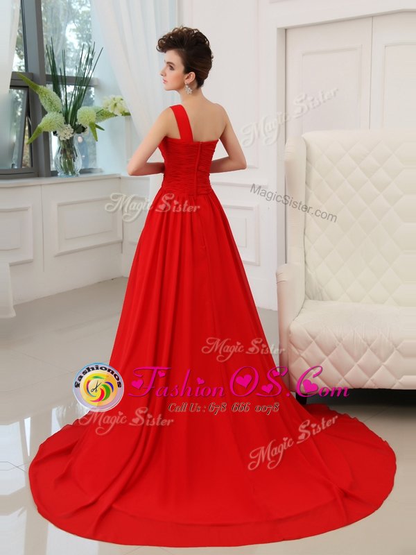 Sophisticated One Shoulder Red Sleeveless Silk Like Satin Court Train Zipper Red Carpet Gowns for Prom and Party