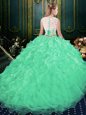 Sophisticated Scoop Green 15th Birthday Dress Organza Court Train Sleeveless Lace and Appliques and Ruffles