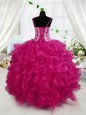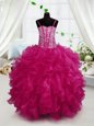 Spaghetti Straps Sleeveless Pageant Gowns For Girls Floor Length Beading and Ruffles Hot Pink Organza