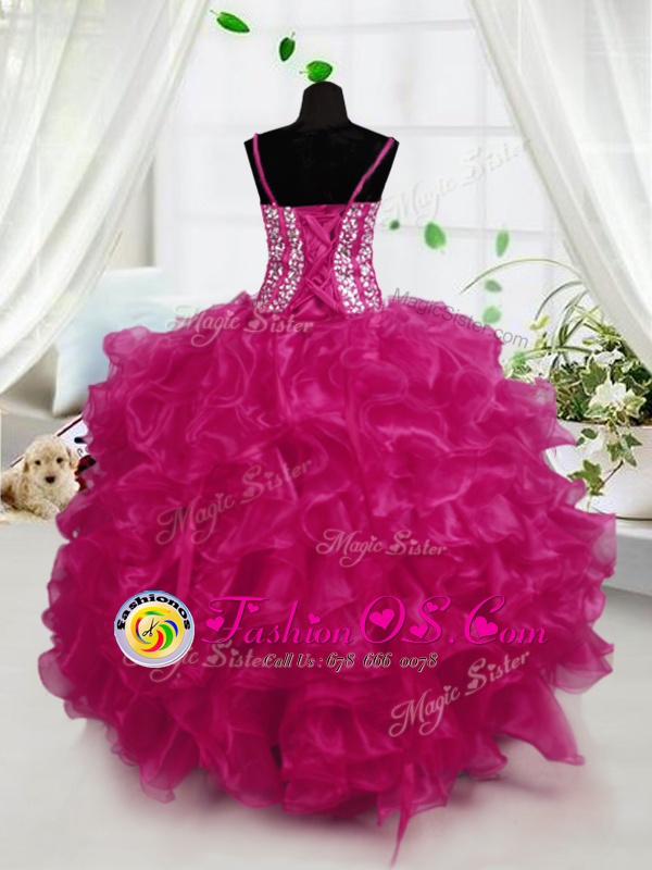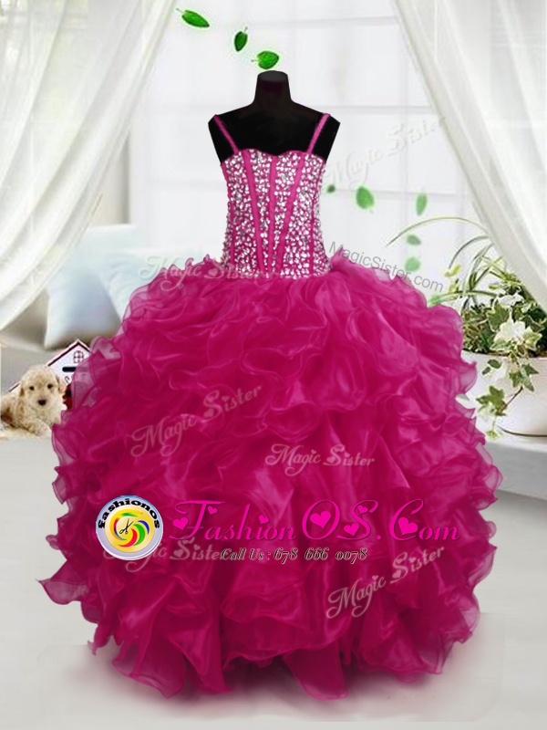Home >  Special Occasion Dresses >  New Style Little Girl Pageant Dresses > Spaghetti Straps Sleeveless Pageant Gowns For Girls Floor Length Beading and Ruffles Hot Pink Organza