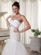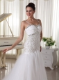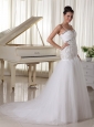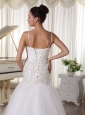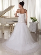You want to be the unique bride to your Mr. right? Yes, this wedding dress is your answer. Unique and fabulous, this dress is like a fatastic dream. Decorated with tulle in the bust and beading around waist and hips, this dress accents with two spaghetti straps. The bodice is longer than the traditional ones that contours your curve greatly. The champel train adds you charm and lace up back secures the dress in place.