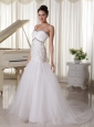 Spaghetti Straps Taffeta and Tulle A-line Wedding Dress With Beaded Decorate Up Bodice Court Train