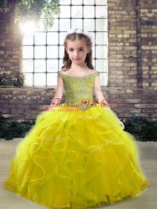 Customized Olive Green Off The Shoulder Neckline Beading and Ruffles Glitz Pageant Dress Sleeveless Lace Up