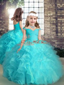 High End Floor Length Teal Pageant Dress Toddler Organza Sleeveless Beading and Pick Ups