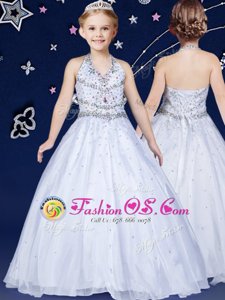 White Ball Gowns Organza Halter Top Sleeveless Beading Floor Length Zipper Flower Girl Dress