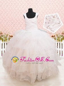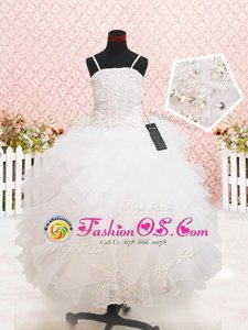 Strapless Sleeveless Flower Girl Dresses for Less Floor Length Beading and Lace and Ruffles White Organza