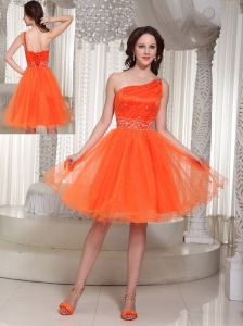 Lace-up Organza Orange Prom Dress With One Shoulder Beaded Decorate In Summer