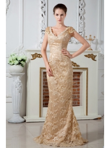 Champagne Column V-neck Lace and Embroidery Mother Of The Bride Dress Brush Train Satin