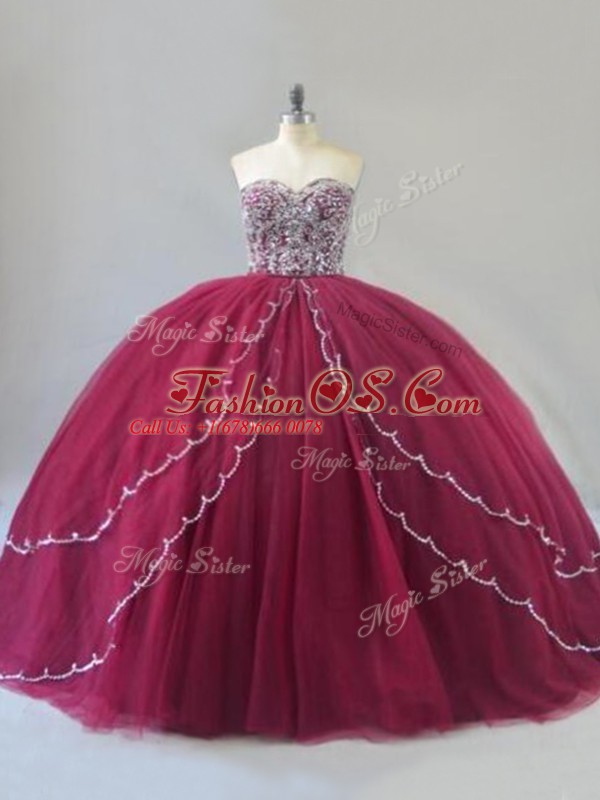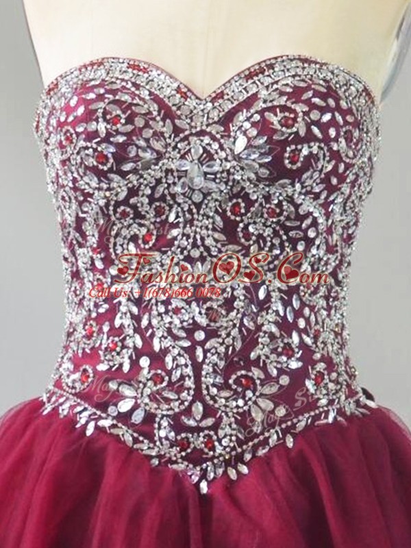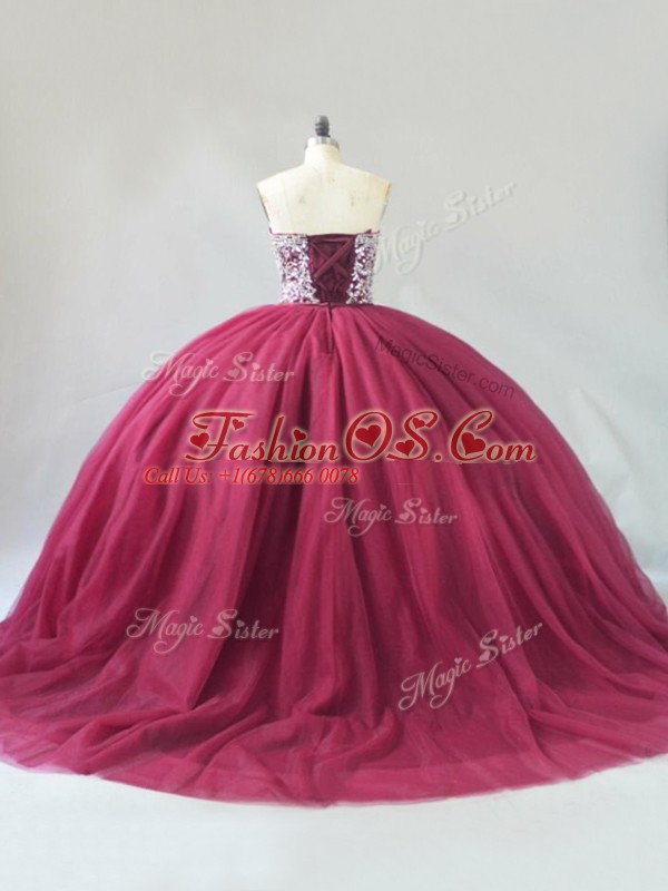 Spectacular Burgundy 15th Birthday Dress Tulle Brush Train Sleeveless Beading