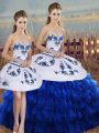 Spectacular Floor Length Lace Up Quinceanera Gowns Royal Blue for Military Ball and Sweet 16 and Quinceanera with Embroidery and Ruffled Layers and Bowknot