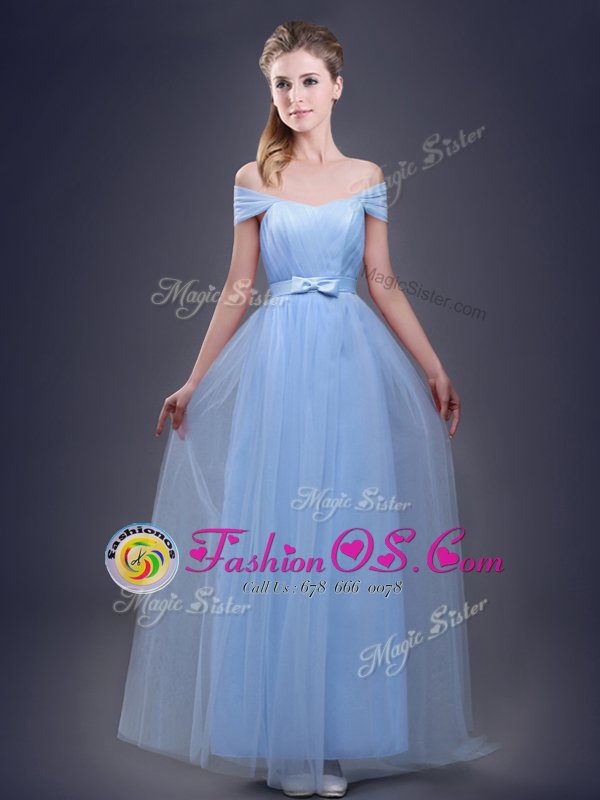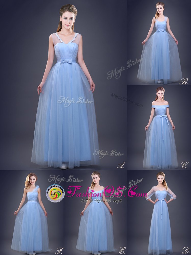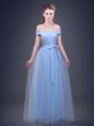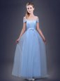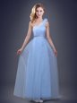 Home >  Special Occasion Dresses >  New Style Dama Dresses > Spectacular Light Blue Tulle Lace Up Sleeveless Floor Length Vestidos de Damas Beading and Appliques and Ruching and Bowknot and Hand Made Flower