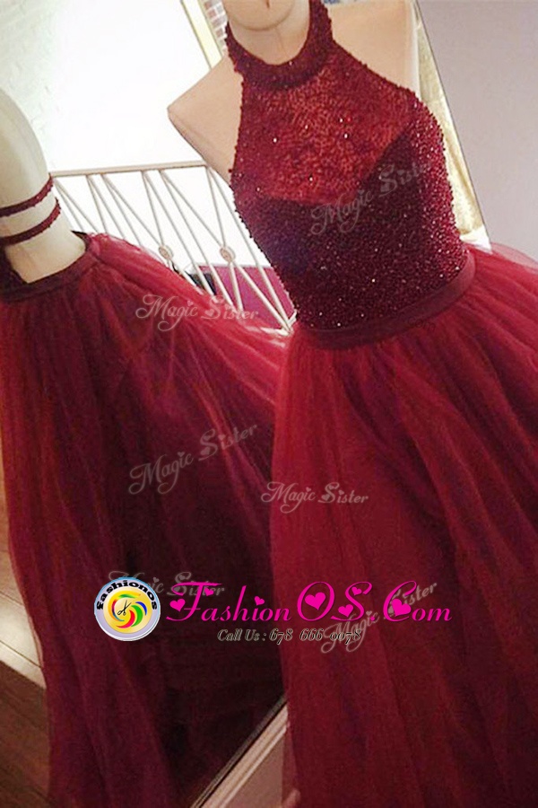 Home >  Prom Dresses >  Perfect Prom Dresses > Spectacular Sweep Train A-line Dress for Prom Burgundy Halter Top Tulle Sleeveless With Train Backless