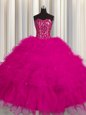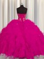 Spectacular Visible Boning Fuchsia Sleeveless Beading and Ruffles and Sequins Floor Length Quinceanera Gowns