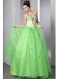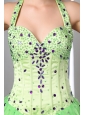 This fashion spring green halter-top neckline dress features a sweetheart neck and dropped waist line and heavily beaded bodice. The full length skirt falls from the body-hugging waist in tiers with a bustle effect. This special ball gown is sure to impress at your next prom or special occasion party. It moves and sways beautifully when you walk, creating a lovely silhouette. A great gown for any formal event or occasion.
