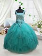 Home >  Special Occasion Dresses >  Little Girl Pageant Dresses > Square Turquoise Tulle Lace Up Little Girl Pageant Gowns Sleeveless Floor Length Beading and Ruffles and Belt