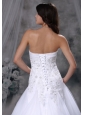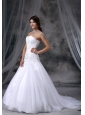 This is a fabulous wedding gown will ensure that princess moment on your day. The strapless dress has a subdued sweetheart shape and laced embellishments throughout the bust. The stunning and sophisticated lace embroidered accents are really eye-catching which strech into the hip and the back. The organza A-line skirt falls freely to the floor extending a sweep train that adds more elegance. A corset-style closure secures the dress in place and ensures a great fit.