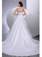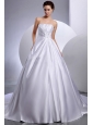 If you are looking for a simple yet elegant dress for your wedding, here is the best dress. This gorgeous straight neckline wedding dress features with the delicate ruchings gathered by a beautiful hand made flower on the waist and the full floor length skirt which looks elegant and modest. The beautiful-shaped skirt cascades to the back to be a court train to add the dress more charm. Zipper up back completes the whole design.