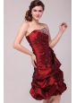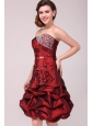 Strapless Knee-length Burgundy Prom Dress with Pick-ups and Beading