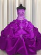 Strapless Sleeveless Ball Gown Prom Dress Floor Length Beading and Appliques and Embroidery Eggplant Purple Taffeta