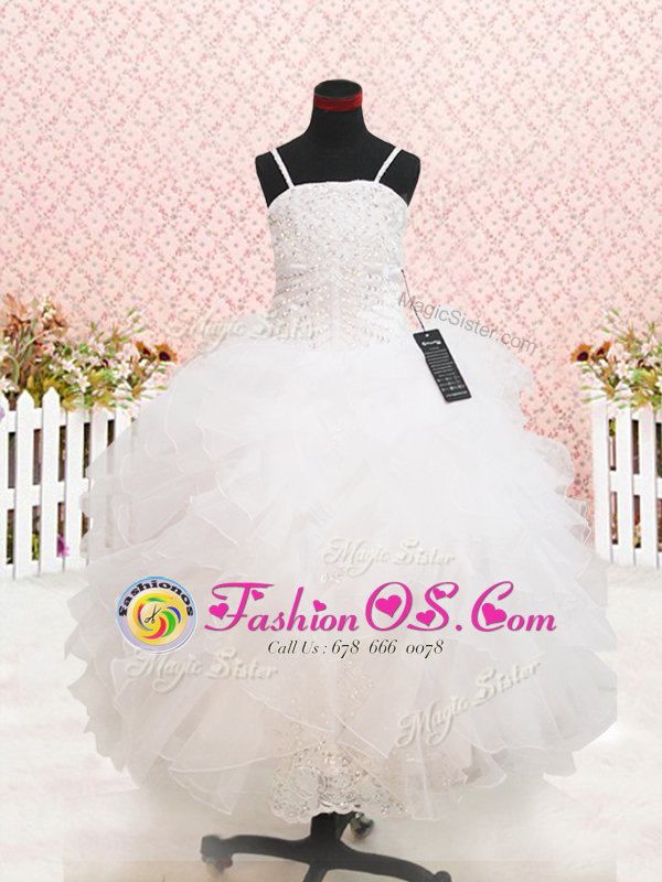 Strapless Sleeveless Flower Girl Dresses for Less Floor Length Beading and Lace and Ruffles White Organza