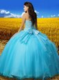 Home >  Quinceanera Dresses >  Custom Made Quinceanera Dresses > Strapless Sleeveless Lace Up Ball Gown Prom Dress Aqua Blue Tulle