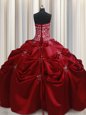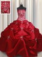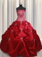 Home >  Quinceanera Dresses >  Fashionable Quinceanera Dresses > Strapless Sleeveless Quinceanera Dresses Floor Length Beading and Pick Ups Wine Red Taffeta