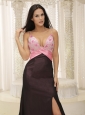 Shine on your special night in this uniquely spaghetti floor-lengh gown. The fitted bodice is highlighted with the beadings and the v-line neckline. The high slit of the floor-lengh skirt will help you stand out from the crowd. The two color skirt adds interest and waistband adorns mid-section of the dress. The deep v-line back shows your skin. A simple zipper up back finishes the look.