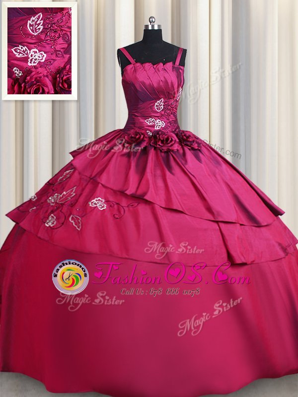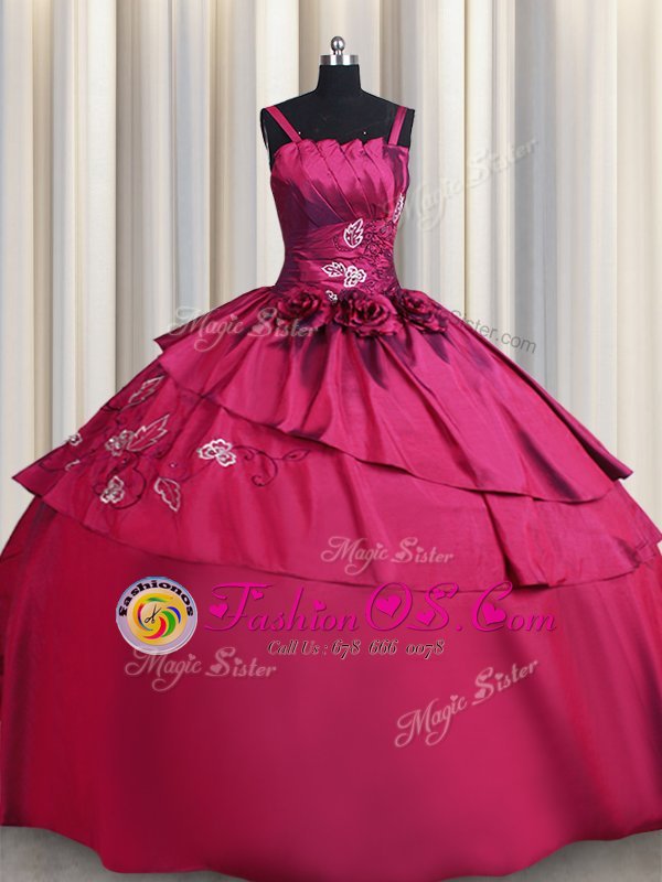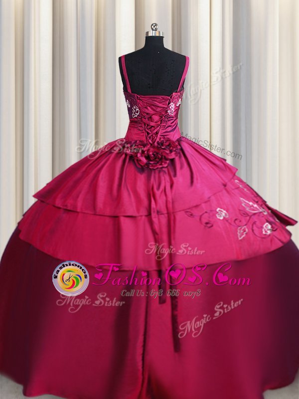 Straps Embroidery and Hand Made Flower Quinceanera Dress Burgundy Lace Up Sleeveless Floor Length