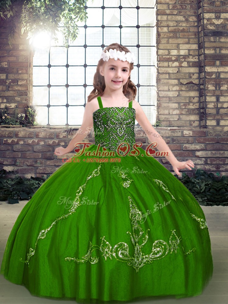 Straps Long Sleeves Lace Up Little Girls Pageant Gowns Green Tulle