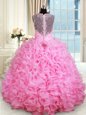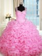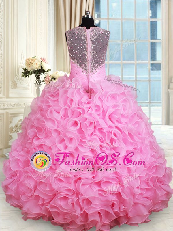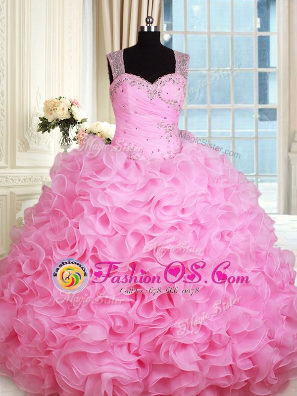 Straps Sleeveless 15th Birthday Dress Floor Length Beading and Ruffles Rose Pink Organza