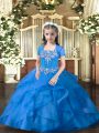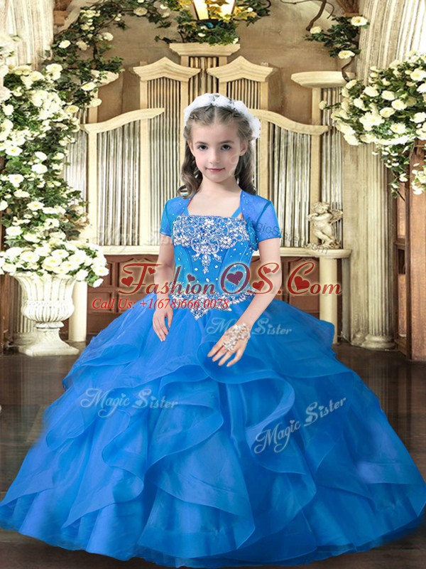Straps Sleeveless Lace Up Pageant Gowns For Girls Blue Tulle