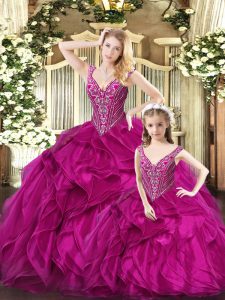 Straps Sleeveless Lace Up Quinceanera Gown Fuchsia Organza