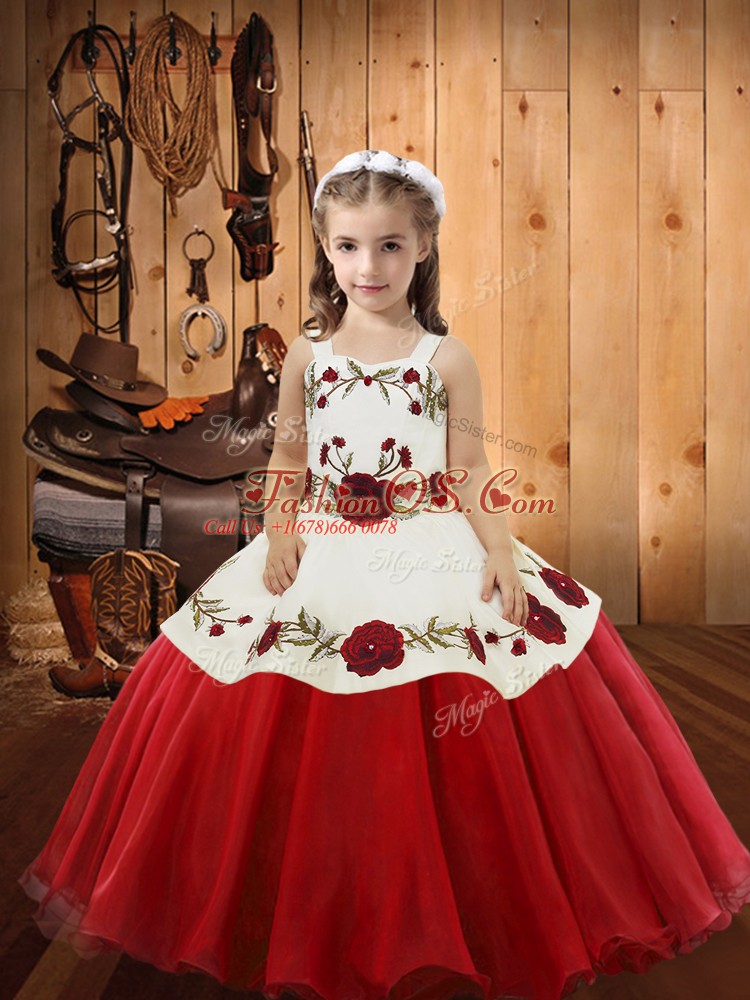 Straps Sleeveless Little Girls Pageant Dress Floor Length Embroidery Red Organza