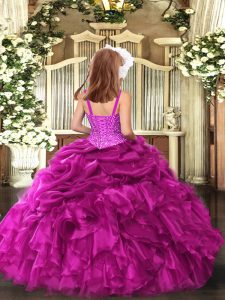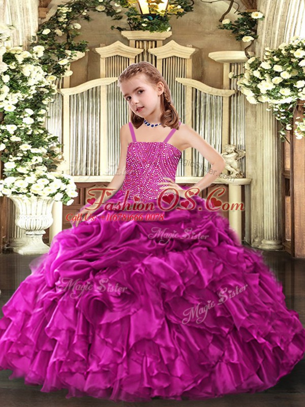Straps Sleeveless Little Girls Pageant Dress Wholesale Floor Length Beading and Ruffles Fuchsia Organza