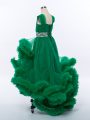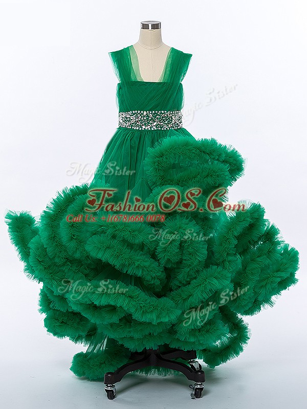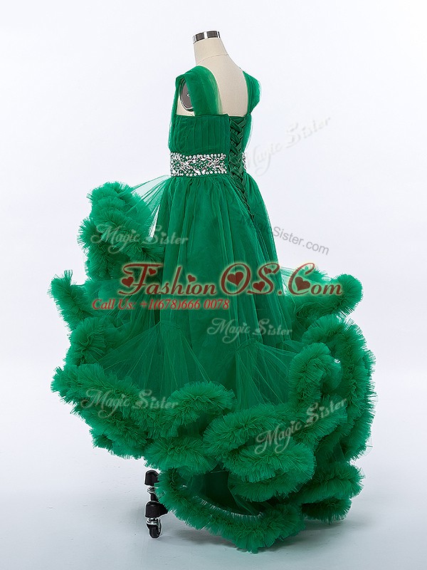 Straps Sleeveless Little Girls Pageant Dress Wholesale High Low Beading and Hand Made Flower Dark Green Tulle
