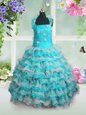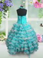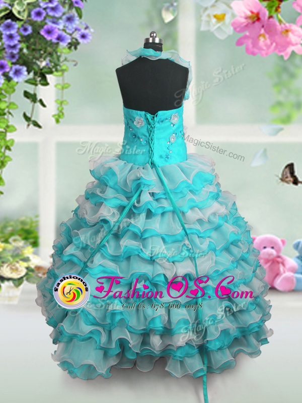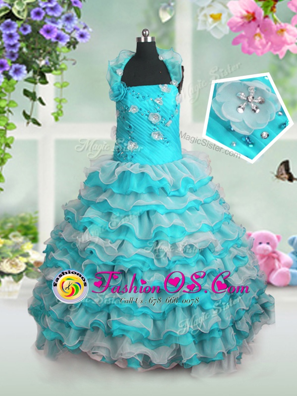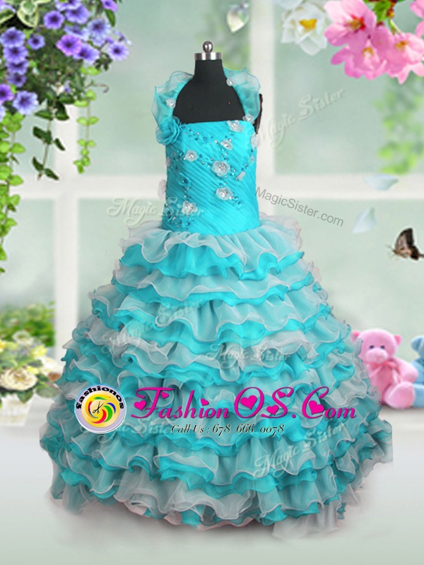 Straps Sleeveless Little Girls Pageant Gowns Floor Length Beading and Appliques and Ruffled Layers Blue And White Organza