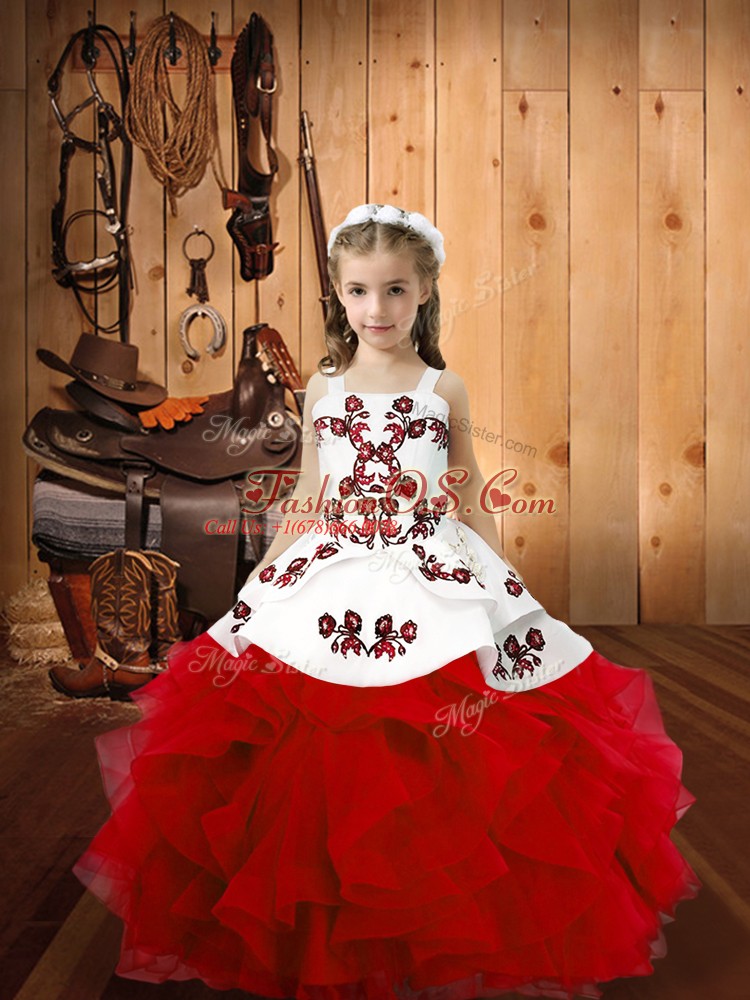 Home >  Special Occasion Dresses >  Beautiful Kids Pageant Dresses > Straps Sleeveless Pageant Dress for Teens Floor Length Embroidery and Ruffles Red Organza