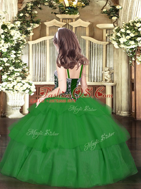 Home >  Special Occasion Dresses >  Beautiful Kids Pageant Dresses > Straps Sleeveless Pageant Dress for Womens Floor Length Beading and Ruffled Layers Olive Green Organza