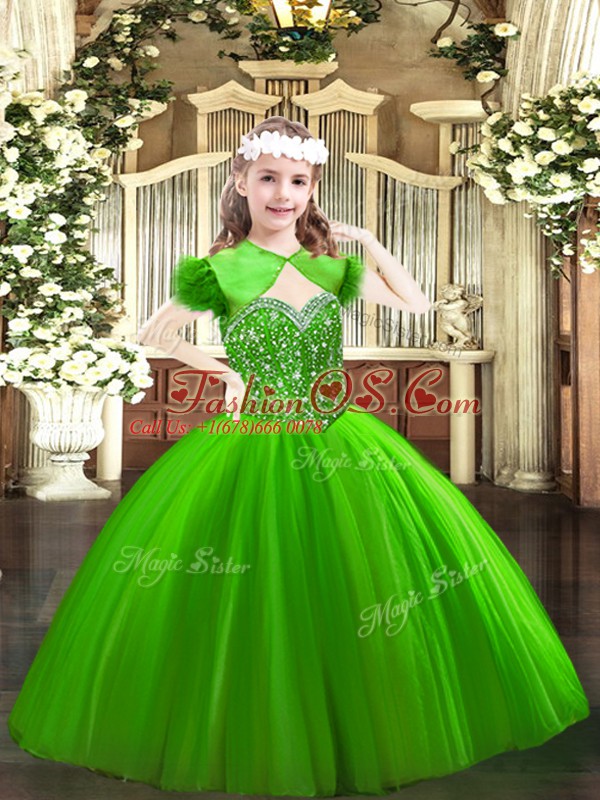 Straps Sleeveless Pageant Gowns For Girls Floor Length Beading Green Tulle
